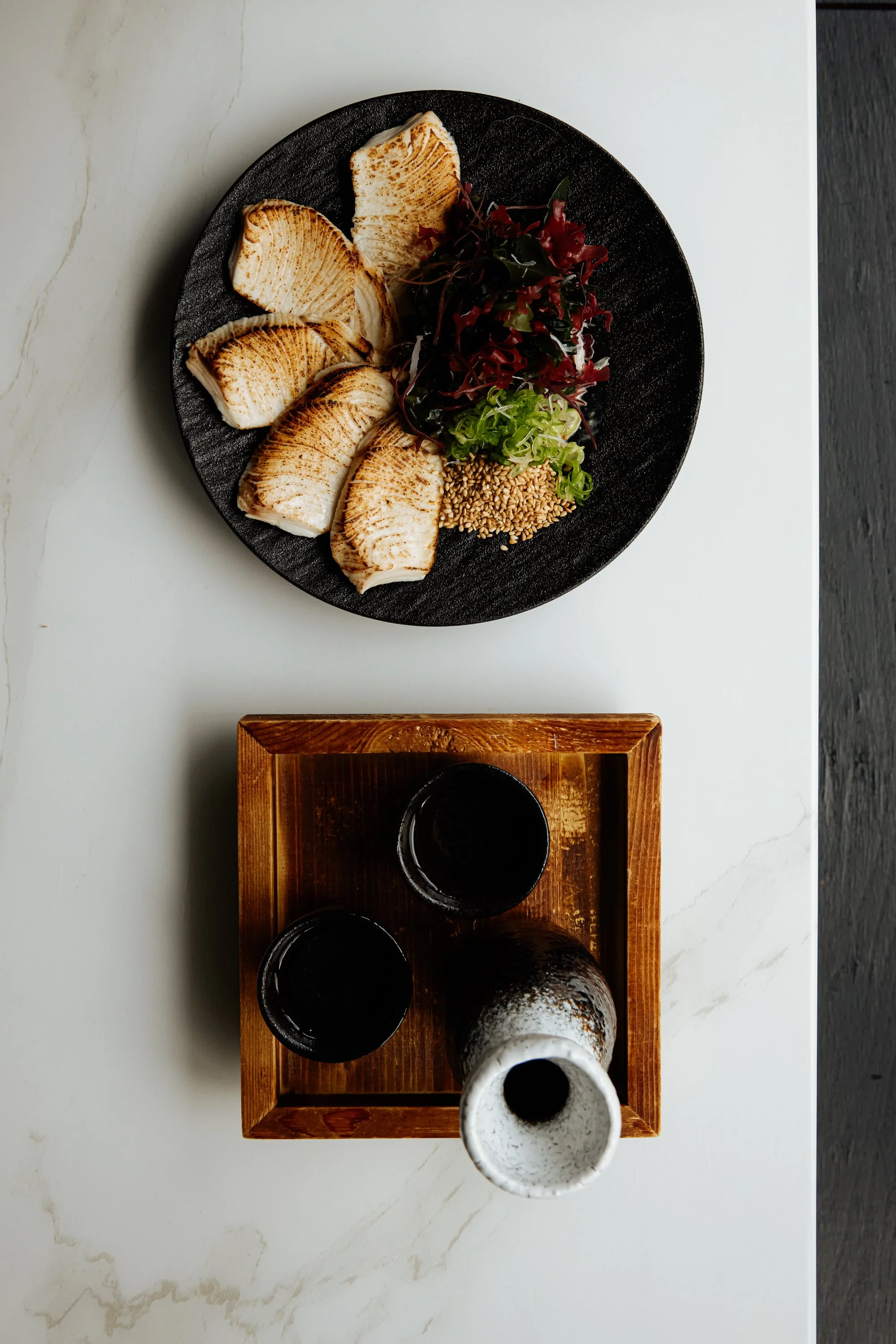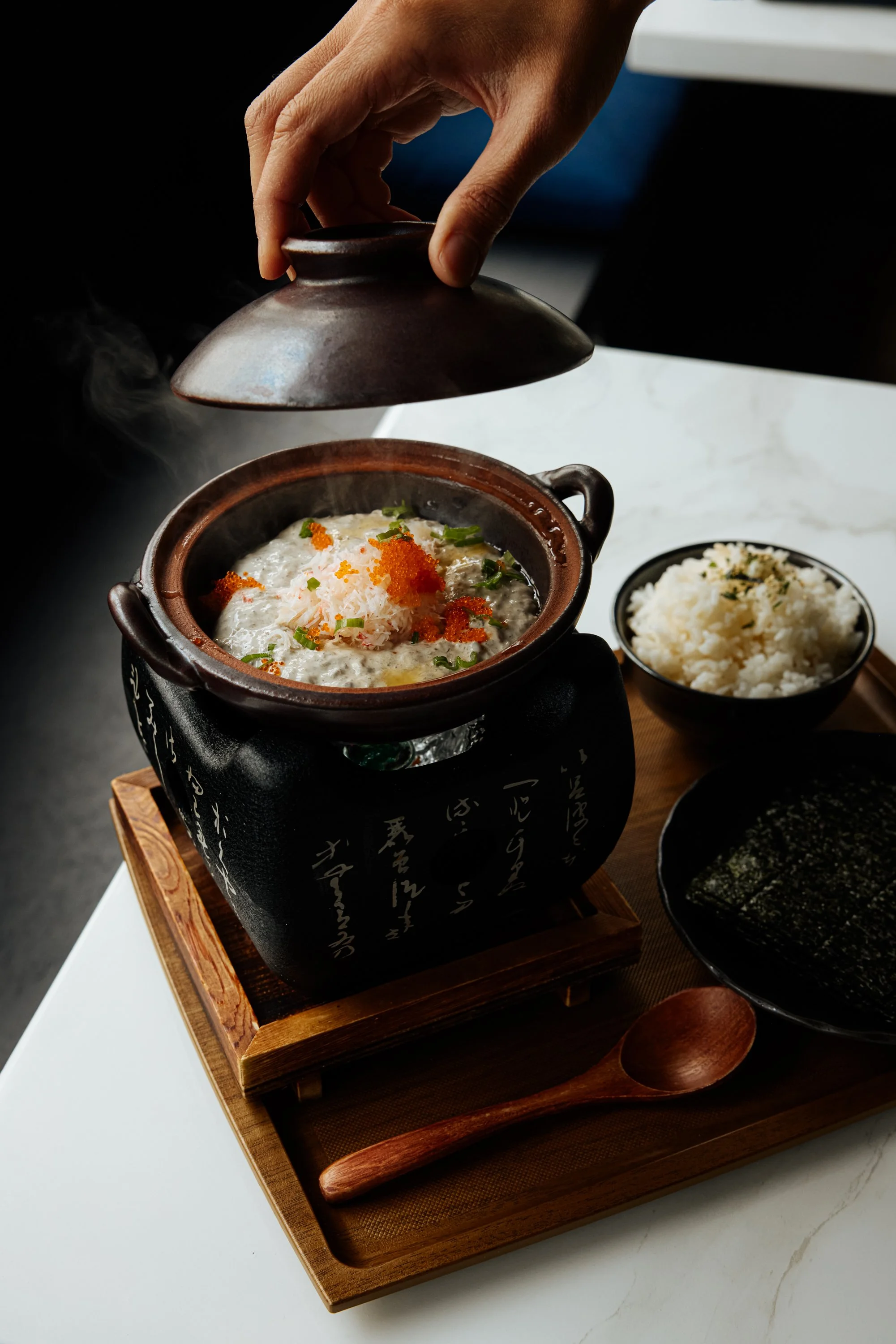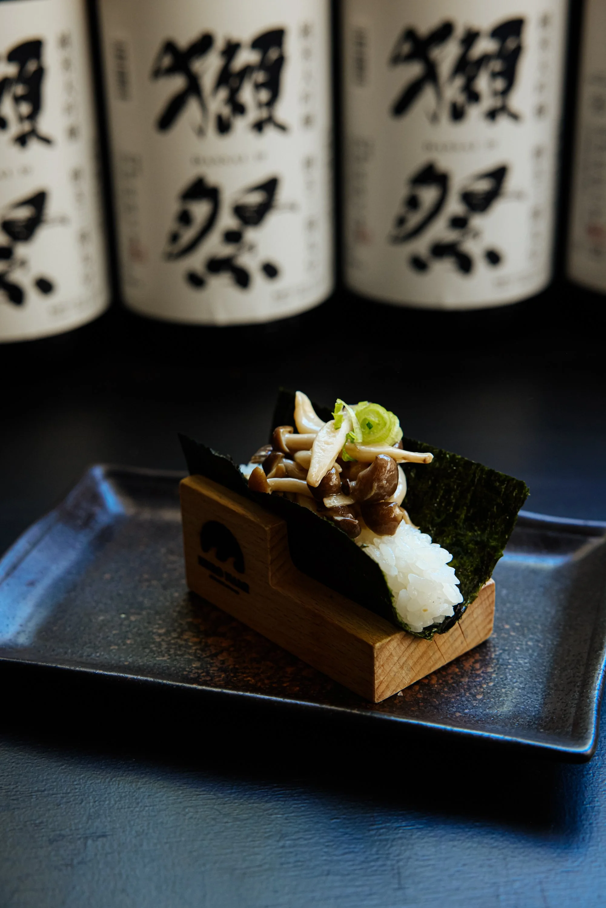 A Japanese dinner menu listing various appetizers, sushi bites, tempura dishes, sashimi, hand rolls, and donburi options, with prices and dietary notes for gluten-free, vegan, and house favorites.