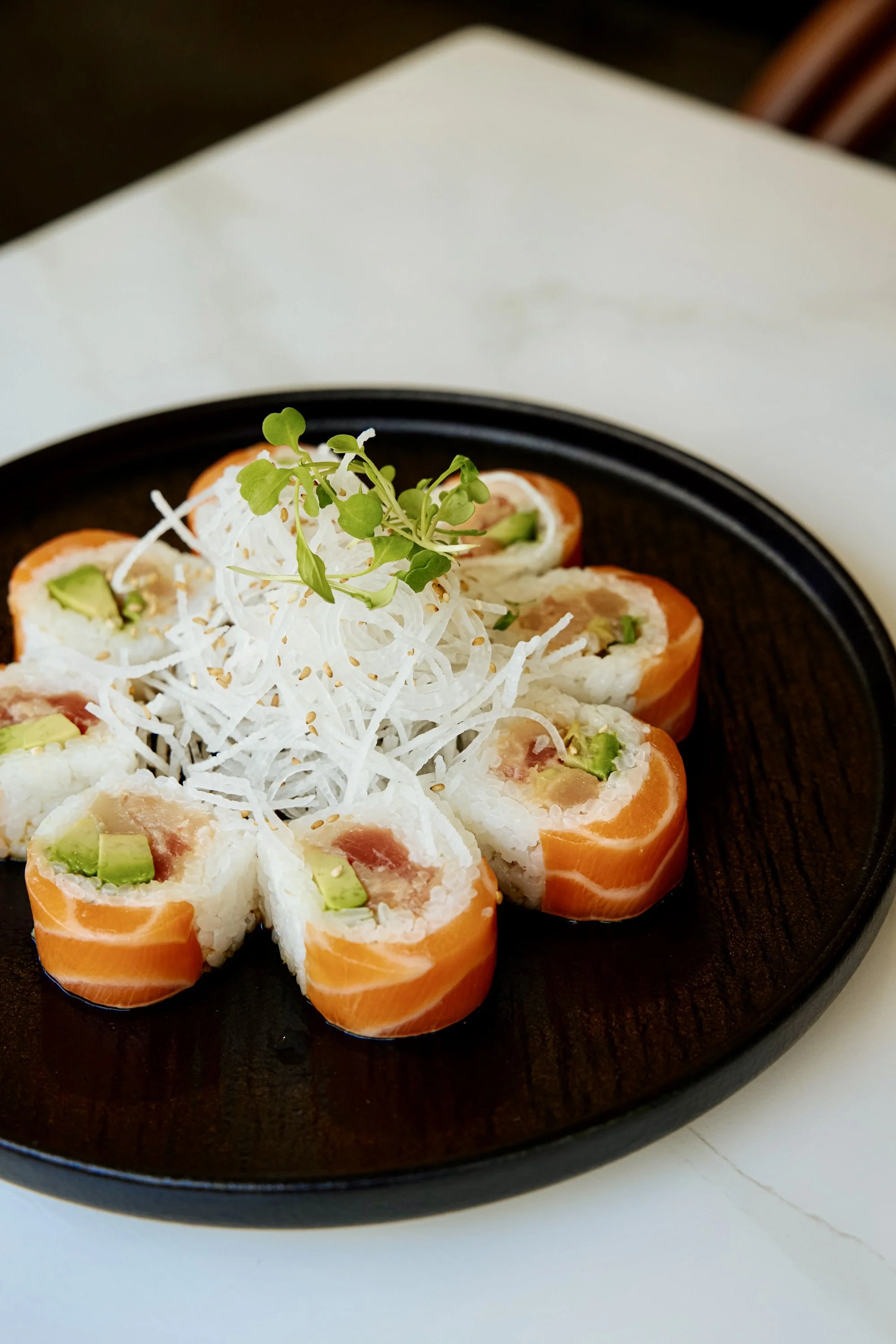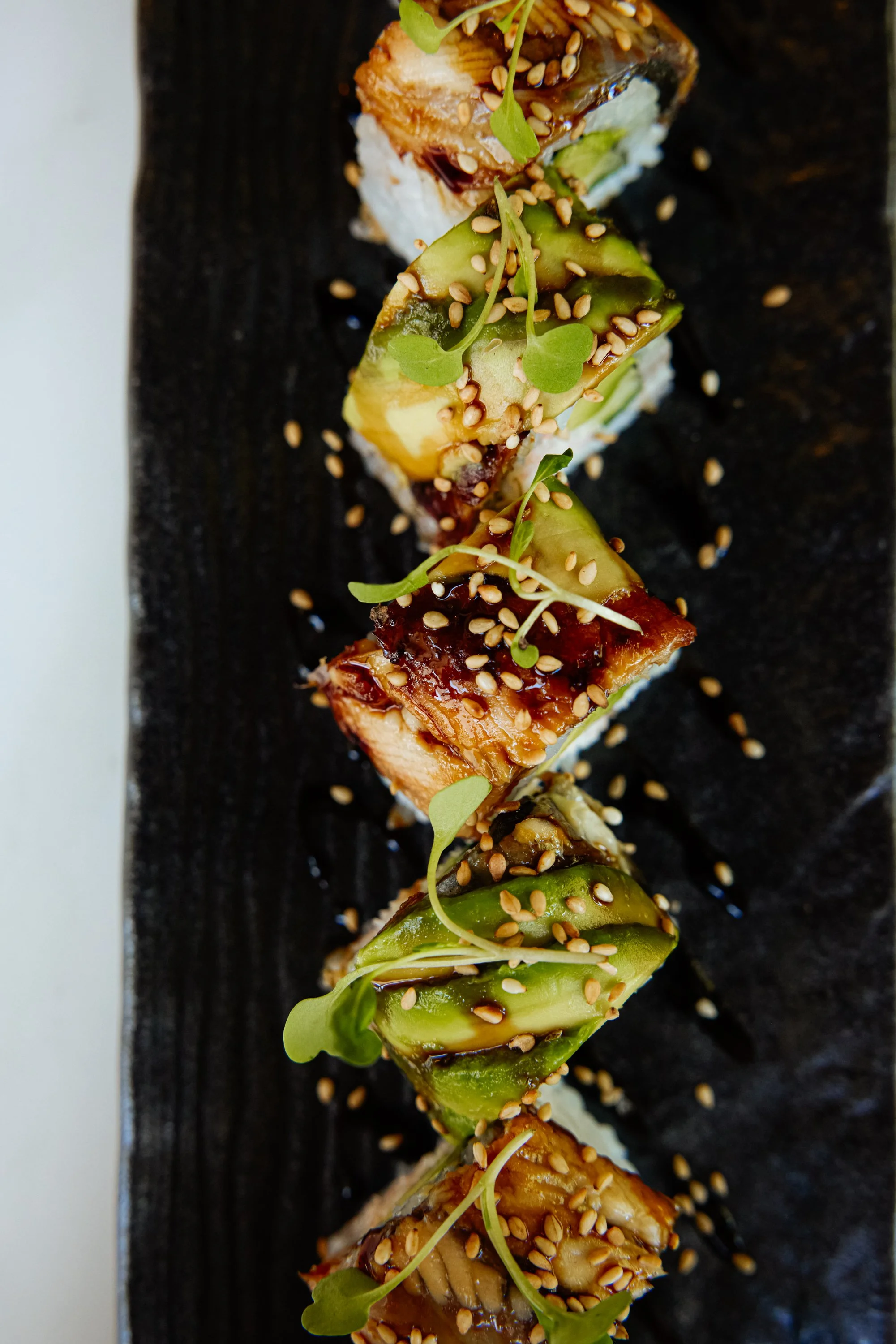 Menu from a sushi bar listing various sushi rolls, nigiri, sashimi, and sides with their prices and descriptions.